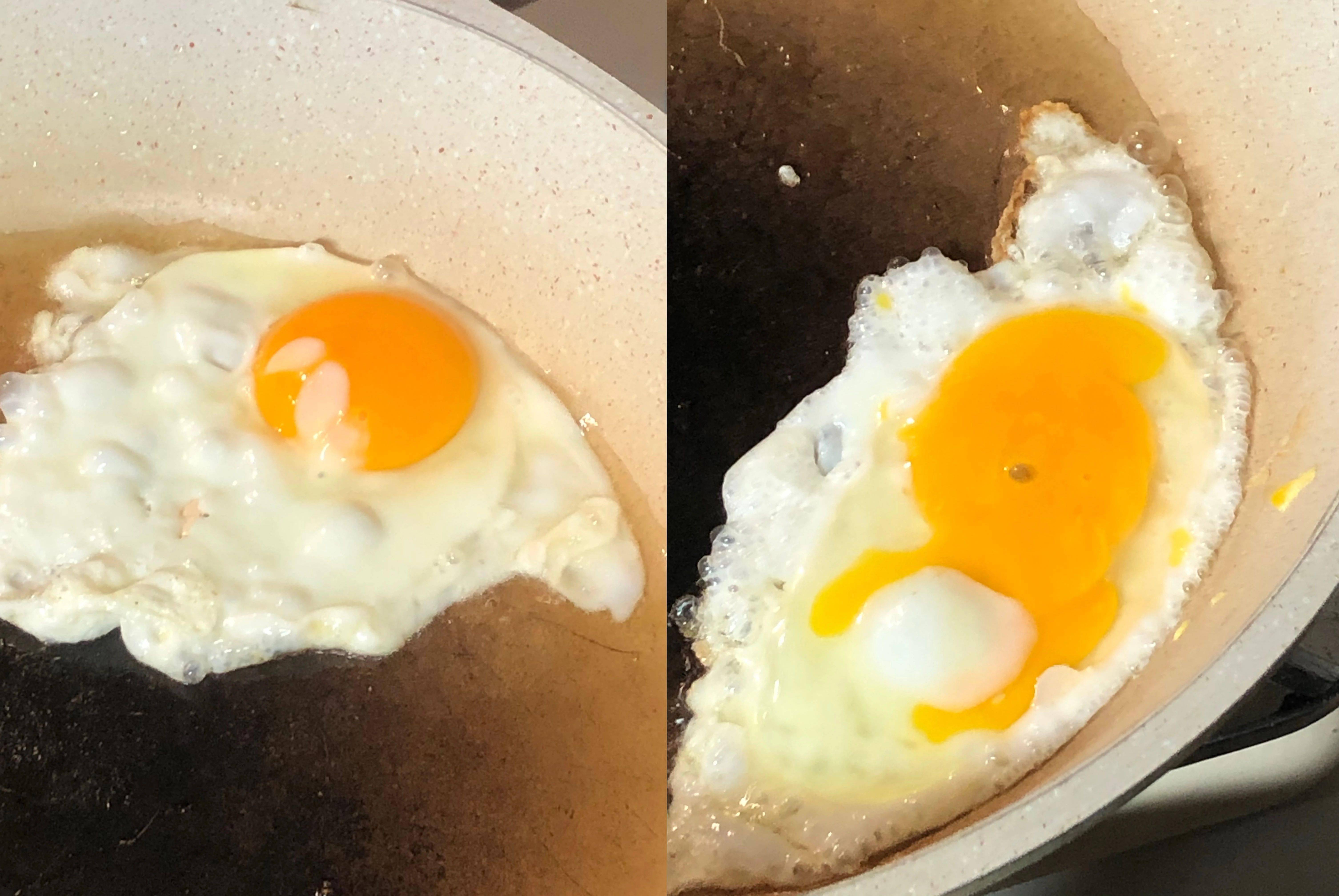 我决定再接再厉,可惜不是 疯狂粘锅,从煎蛋变成了炒蛋,就是 翻面失败,蛋黄惨烈破碎……