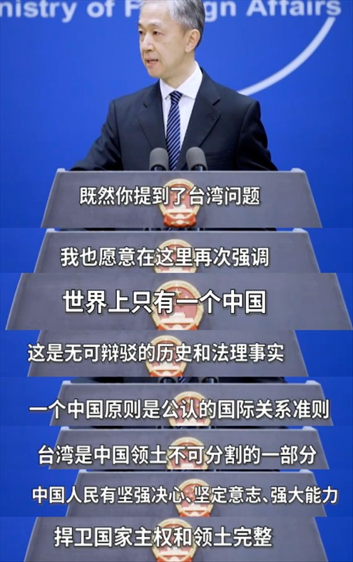 既然你提到台灣問題,我願強調,世界上只有一個中國台灣中國領土不可分割的一部分,這是無可辯駁的歷史和法理事實。一個中國原則是公認的國際關系准則。中國人民有堅強決心、堅定意志、強大能力扞衛國家主權和領土完整。