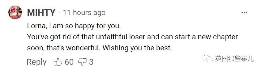 “洛娜,我真为你高兴,你摆脱了这个不忠的失败者,很快就可以开始新的篇章。祝你一切顺利。”