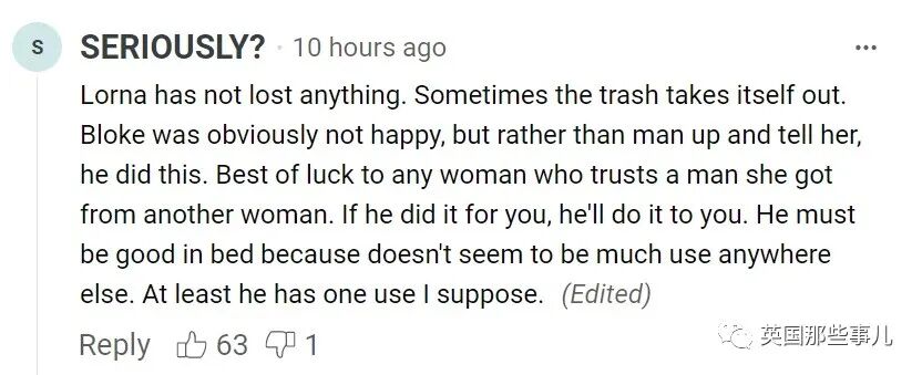 “洛娜什么都没失去。有些时候,垃圾是会自己倒掉的。这个男人显然之前过得不开心,但他不直接告诉她,而是选择出轨。对那些第三者成功上位的女人们,如果你们信任自己抢下的男人,我只能说,祝你好运。如果他敢为你劈腿,将来就敢劈腿你。文中这家伙,他可能床技不错,不然我看不出他有什么用。他总得有一个用处吧。”