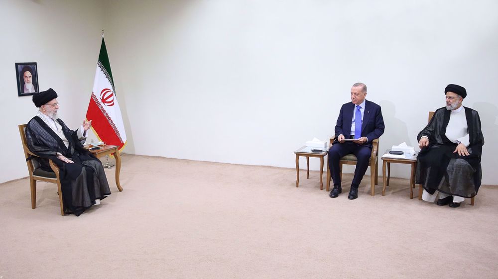埃尔多安(中)同伊朗最高领袖哈梅内伊、伊朗总统莱希举行会谈,图自Press TV