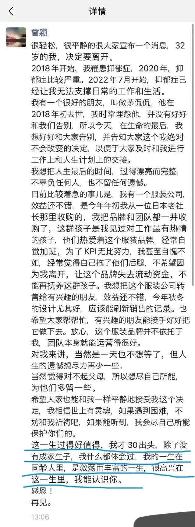 今日,网上传出了一条曾颖的微信朋友圈,在这条朋友圈中,曾颖发了一条长长的遗书。表示自己将平静地离开这个世界,她从2018年开始就患上抑郁症,今年7月已经无法支撑正常的生活和工作。曾颖最后写道“我才30出头,除了没有成家生子,什么都体会过,我的人生在同龄人里,是激荡而丰富的一生,很高兴在这一生里认识你。感恩,再见!”