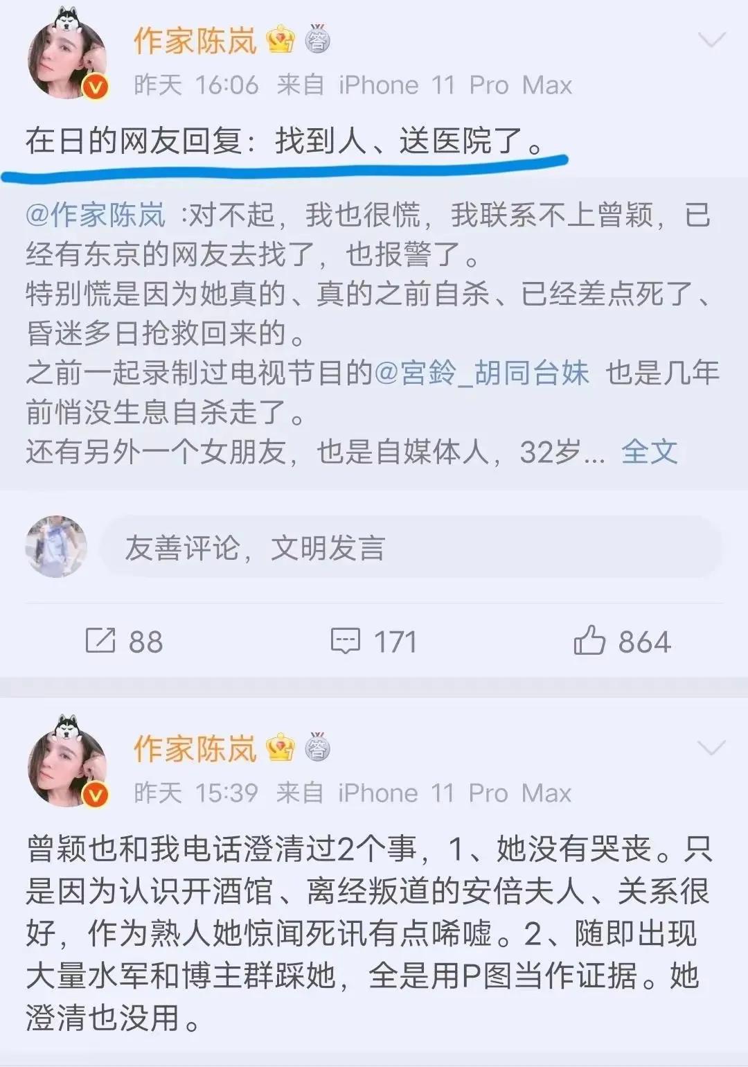 曾颖的好友陈岚看到这条朋友圈后马上打电话联系曾颖,东京的网友也去报警,并且找到曾莹把她送进了医院,目前曾颖的情况还是不得而知。