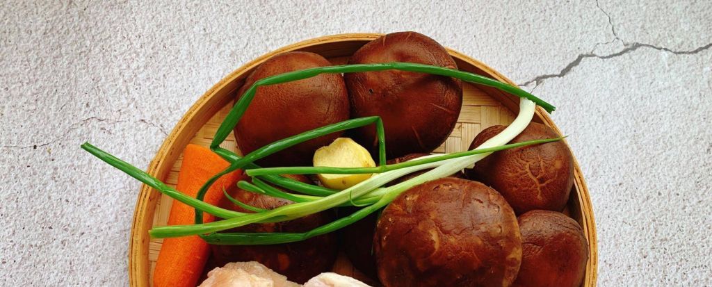 鸡胸肉一块,香菇200个,生姜一块,胡萝卜一小段,香葱一根,鸡蛋一个。
