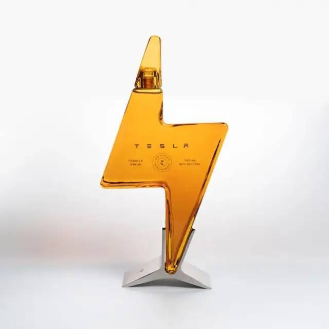 这款酒装在闪电形的酒瓶里,由金属底座支撑着。它的价格是250美元,据喝过它的人说,特斯拉龙舌兰酒的味道还不错,有淡淡的香草味。