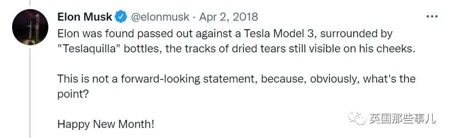 2018年的愚人节,马斯克在推特上写道,特斯拉彻底破产了,”可怜的埃隆被发现昏倒在Model 3旁,周围到处是特斯拉龙舌兰酒的空瓶,几滴泪痕在他的脸颊上清晰可见……”
