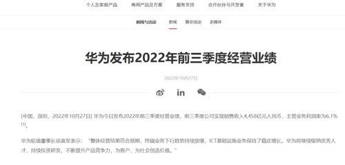 27日,華為發布2022年前三季度經營業績,前三季度公司實現銷售收入4458億元人民幣,主營業務利潤率為6.1%。