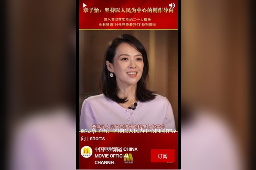 章子怡说她自己“领会了总书记的要求,将切实贯彻落实党的二十大精神,也就是坚持以人民为中心的创作导向…”。(图片撷取自Youtube中国电影频道)