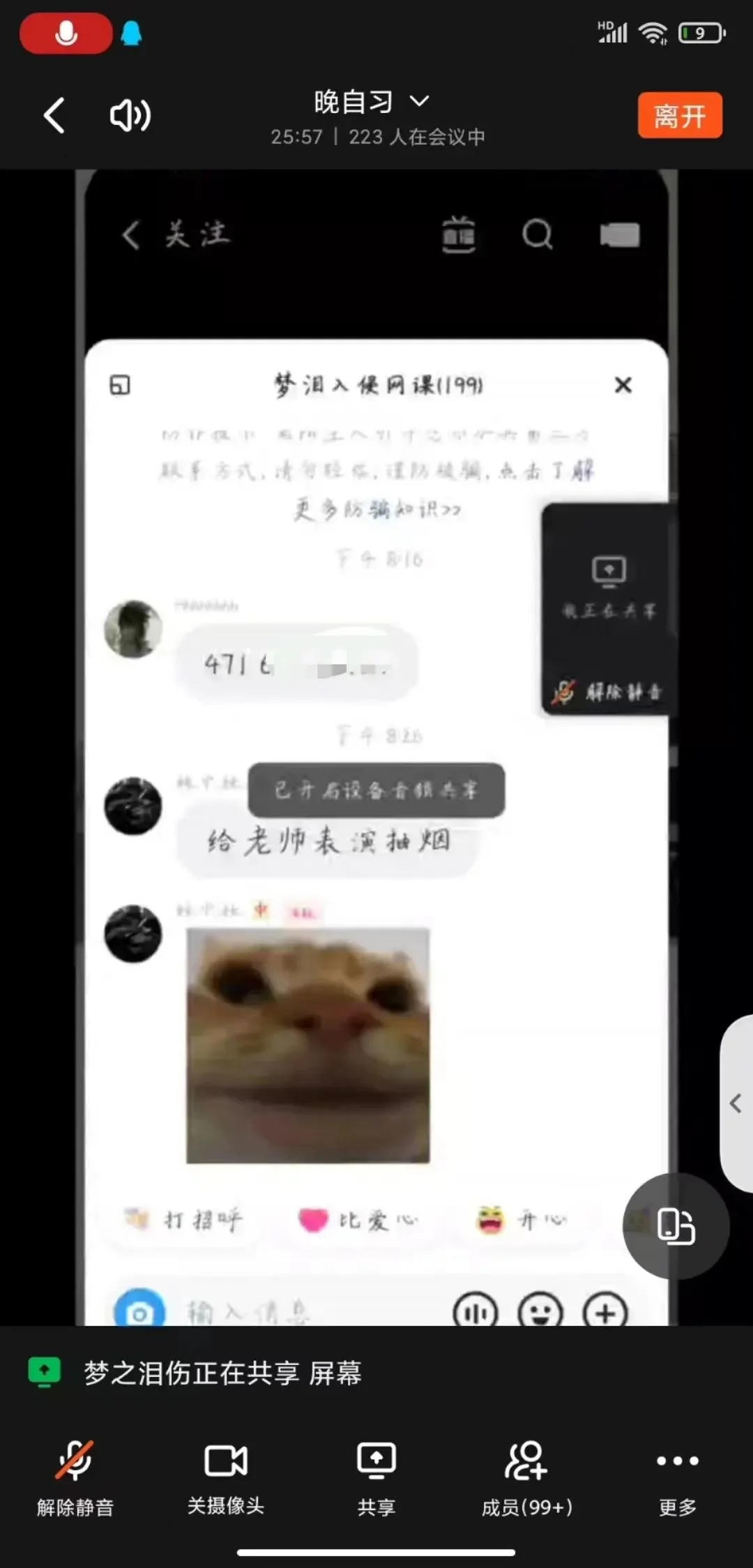 在“夢之淚傷”控制共享屏幕之後,所有人都能看到“夢之淚傷”視角的屏幕,他偶爾切換到其他聊天界面,張斯威眼疾手快地截圖了一張疑似爆破獵手組織的群聊。圖片顯示,那是一個名叫“夢淚入侵網課”的聊天群,群成員一共有199人,其中有人在群裡發了一串數字,疑似一串會議號,另一人在群裡說“給老師表演抽煙。”