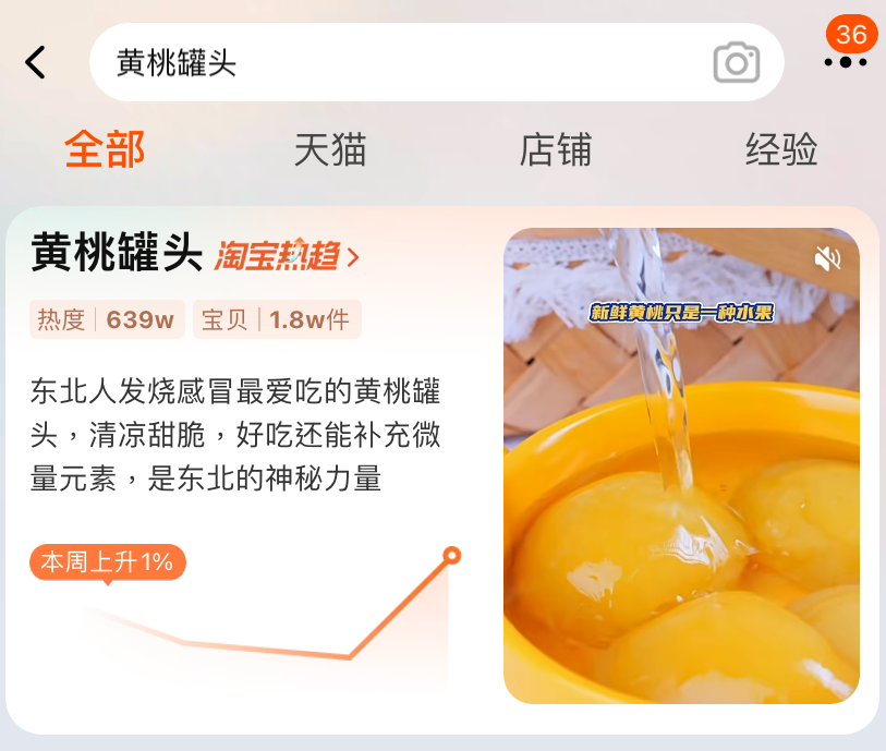 淘寶商城的“淘寶熱趨”搜索結果顯示,黃桃罐頭排名出現在前列