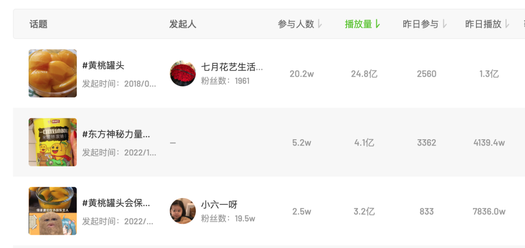 據飛瓜數據統計,“黃桃罐頭”相關的話題播放量一度達到了24.8億。