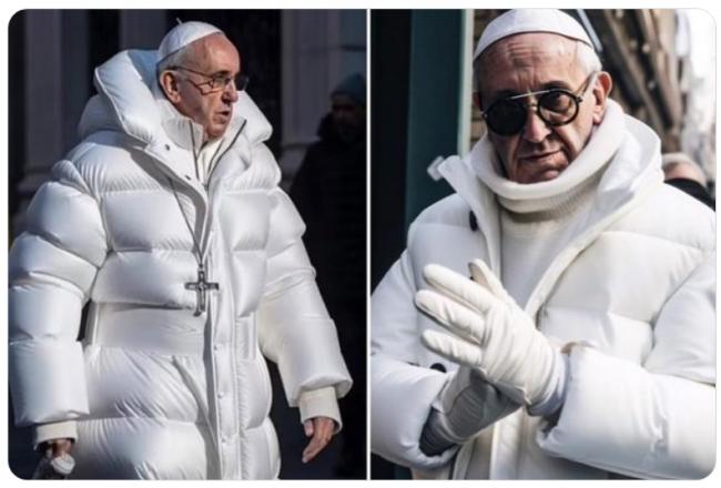 又比如教宗方濟各的這兩張照片,你會看到右邊的這幅他似乎只有四根手指?而左邊的照片他的手指好像有點略長。兩張照片都是假的。