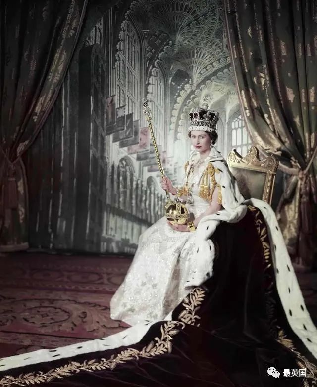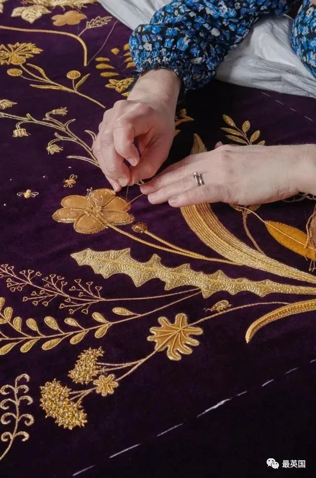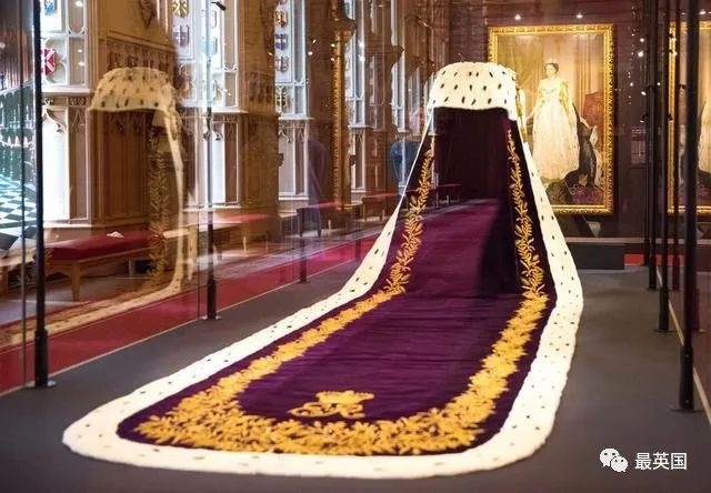 女王的庄园长袍长5.5米,为紫色天鹅绒材质,两边有金色植物刺绣,包括英格兰的玫瑰、苏格兰的蓟、北爱尔兰的三叶草。