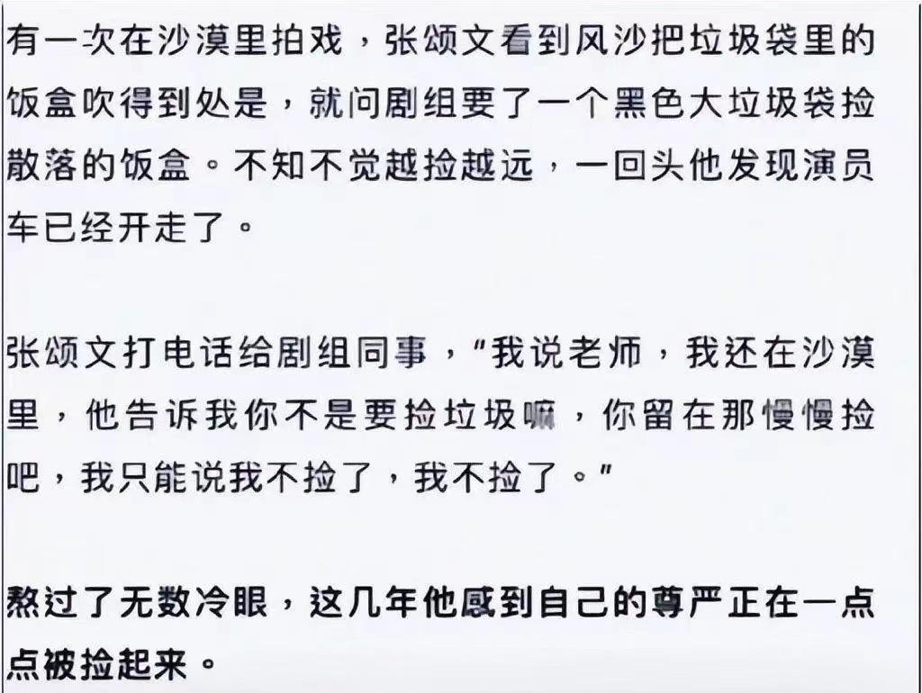 張頌文同樣如此,早年在沙漠取景時,因打掃衛生引起劇組的不滿,等他撿完垃圾回來時卻發現劇組的車已經開走,打電話給同事更是換來了一頓冷嘲熱諷。