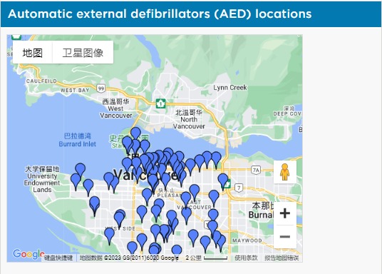 温哥华市公共场合的自动体外除颤器 (AED)分布图: