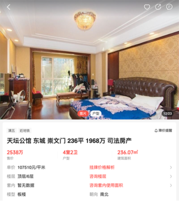 去年被判“死缓”的前正部级官员傅政华豪宅房产中介挂牌近2600万元,法院拍卖近2000万,无人竞标。图为天坛公馆同类户型。房天下网页截图。