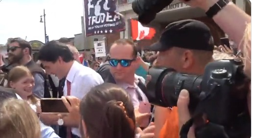 可以看到在安全团队包围穿过人群时,特鲁多只能尴尬地微笑。