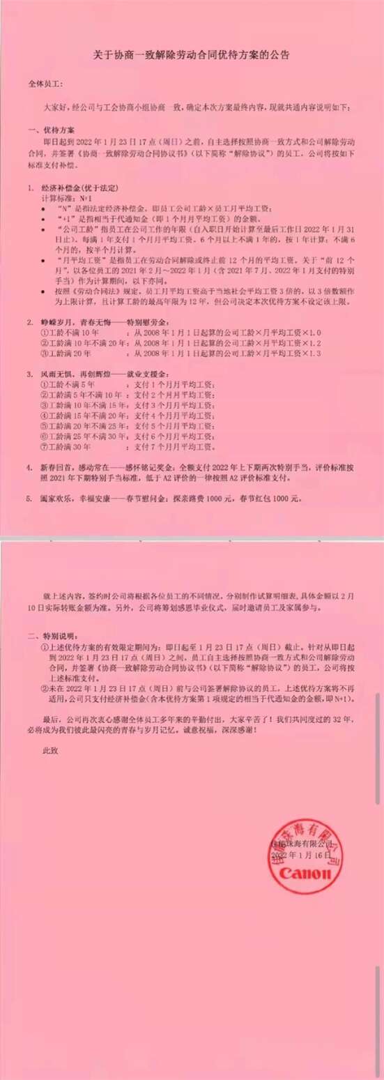 2022年1月17日,界面新聞發布了佳能珠海有限公司的《關於協商一致解除勞動合同優待方案的公告》,公告顯示,員工遣散費用包括5部分: