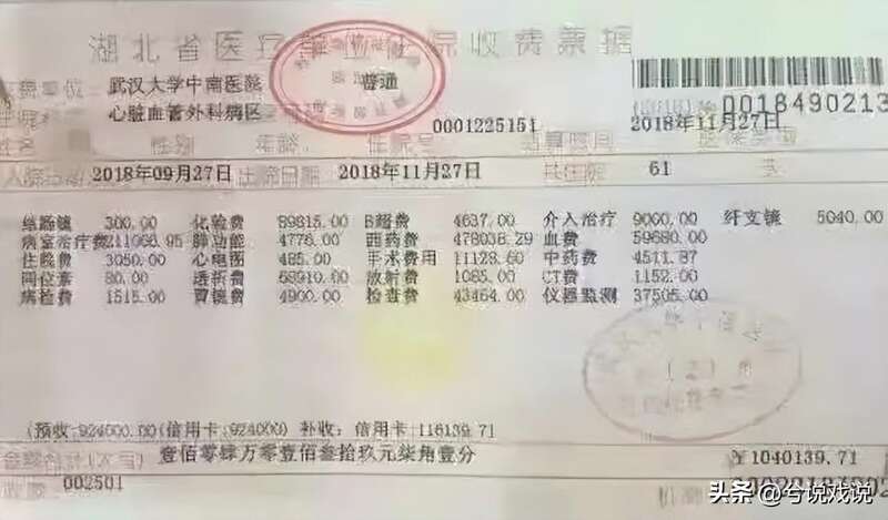 2018年,武漢大學中南醫院,也出現了一張天價藥單,一位心腦血管病人住院61天,花費醫藥費104萬!