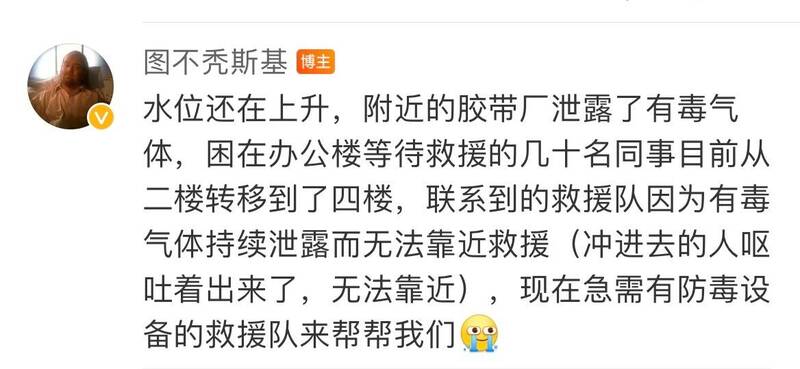 涿州警方表示,当地需要大量船隻撤离受灾民众,涿州全市停水,部分地区停电。稍早更传出涿州的“中图网仓储中心”附近的胶带厂泄露有毒气体,救援队因有毒气体持续泄露而无法靠近,急需有防毒设备的救援队。