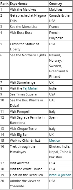 該名單主要以美國目的地為主,似乎旅行者在願望清單熱衷於美國旅行目的地,例如參觀紐約市時代廣場、前往美國首都白宮以及參觀舊金山臭名昭著的惡魔島監獄,並欣賞加利福尼亞州約塞米蒂國家公園的景色。