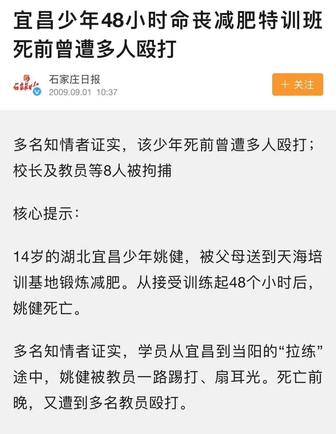 2015年,湖北宜昌就有一名未成年兒童在訓練營因身體多處軟組織損傷引起急性腎衰竭死亡。後續,訓練營承認有8位教練在該兒童拉練喊苦喊累時對他進行毆打。