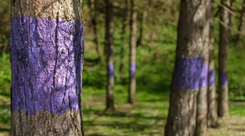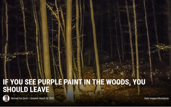 如果你外出露營、徒步旅行、打獵或只是在樹林中享受大自然的美景時,看到了被紫色油漆塗上的樹木,切記,請勿繼續前行,轉身離開以避免不必要的麻煩。