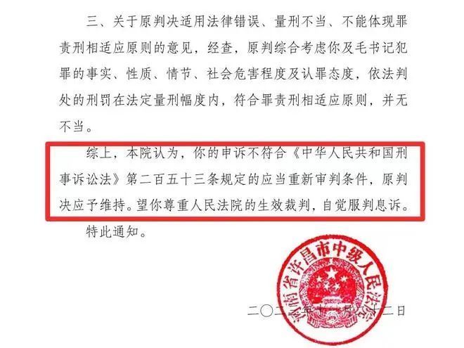 2023年11月22日,许昌中院也驳回了曹丽霞的申诉,并希望曹丽霞“尊重人民法院的生效判决,自觉服判息诉”。