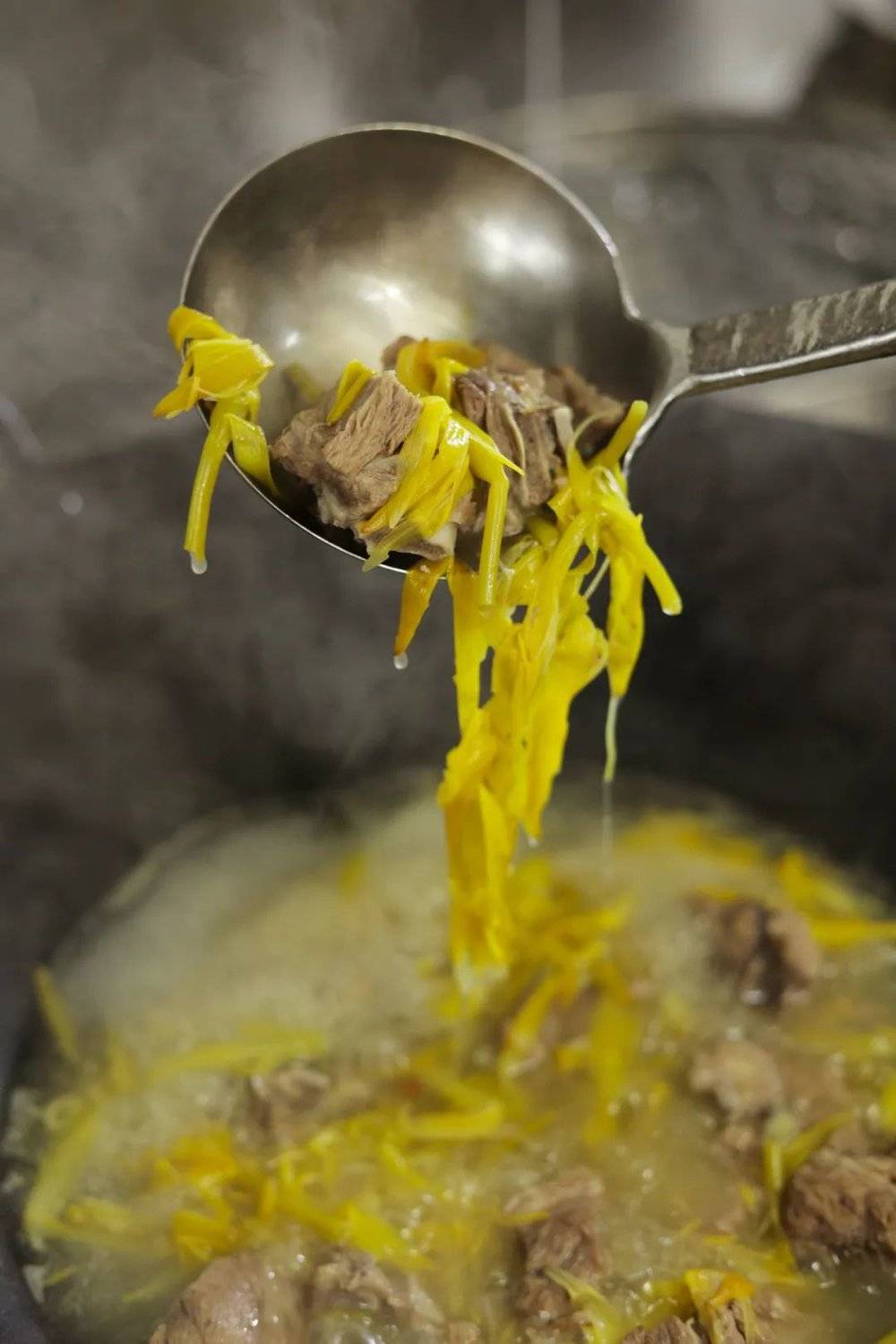 关于如何炖好一锅羊肉,配菜的选择也至关重要。在汤里加一些白萝卜,萝卜的鲜甜渗入滩羊肉的筋膜;能让肉香减去几分油腻;黄花菜也是滩羊的好搭档,盐池盛产黄花菜,趁着晨露未起就到田里摘的黄花菜最为香甜。盛夏阳光滋润过的黄花菜,俯倒在羊肉的油脂和柔润有嚼劲的杂粮当中,层层香叠的口感,能让每个喝着黄花菜汤、咬着羊排的人,都感受到大漠里的“天与地”。