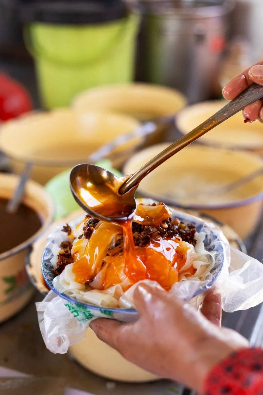 羊肝凉皮,是全国凉皮界里少有的“荤凉皮”,薄而宽的盐池凉皮盖上一层黑褐色羊肝,一方带着爆裂香气,一方带着素冷冰清,羊肝夹杂着蒜汁的香气,透过晶莹的凉皮扑鼻而来,筷子一挑,便让味蕾瞬间沦陷。