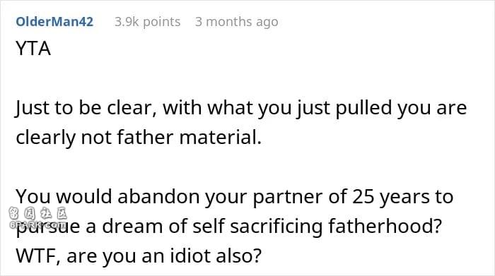 你居然会为了追求一个关于自我牺牲的成为父亲的体验而抛弃你长达25年的伴侣,什么鬼,你也是一个傻瓜吗?”