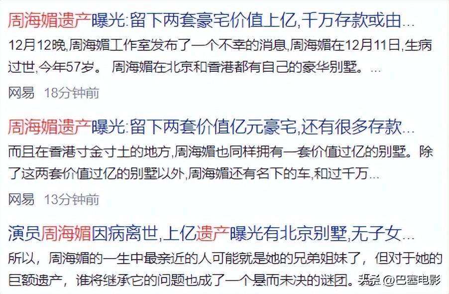 还有一部分观众对明星的资产感到好奇,于是网上关于周海媚遗产分配的新闻也是层出不穷。而细看周海媚一生之后,才发现她的生活并没有大家想象中那么好。