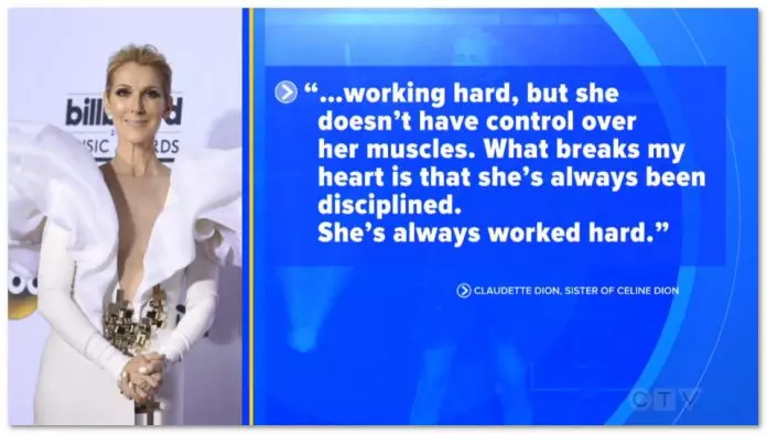 2016年,她的丈夫Rene患癌症去世后,席琳·迪翁因过度悲伤和疲劳,而患上肌肉痉挛、听力障碍、视网膜病变等疾病。当时医生认为她仅仅只是普通的肌肉痉挛,直到病情恶化,才于去年12月宣布确诊僵人综合征。