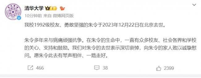 清华大学发文悼念写道,“朱令多年来与病痛顽强抗争。在朱令的生命中,一直有众多校友、社会各界和学校的关心、支持和鼓励。我们对朱令的去世表示深切哀悼,向朱令的家人致以诚挚慰问。愿朱令此去有琴声相伴、一路走好”。