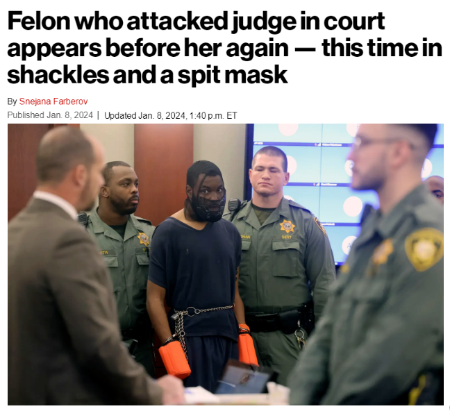 为了防止他再次“出手”or“出口”,这名暴徒被执法人员“全副武装”,头套“金刚罩”,手戴“全包手套”,脚带“金属脚铐”。