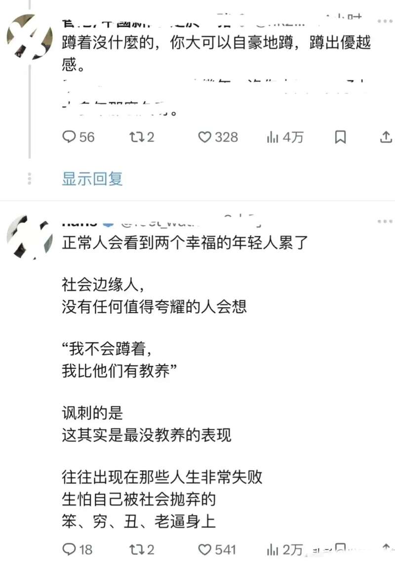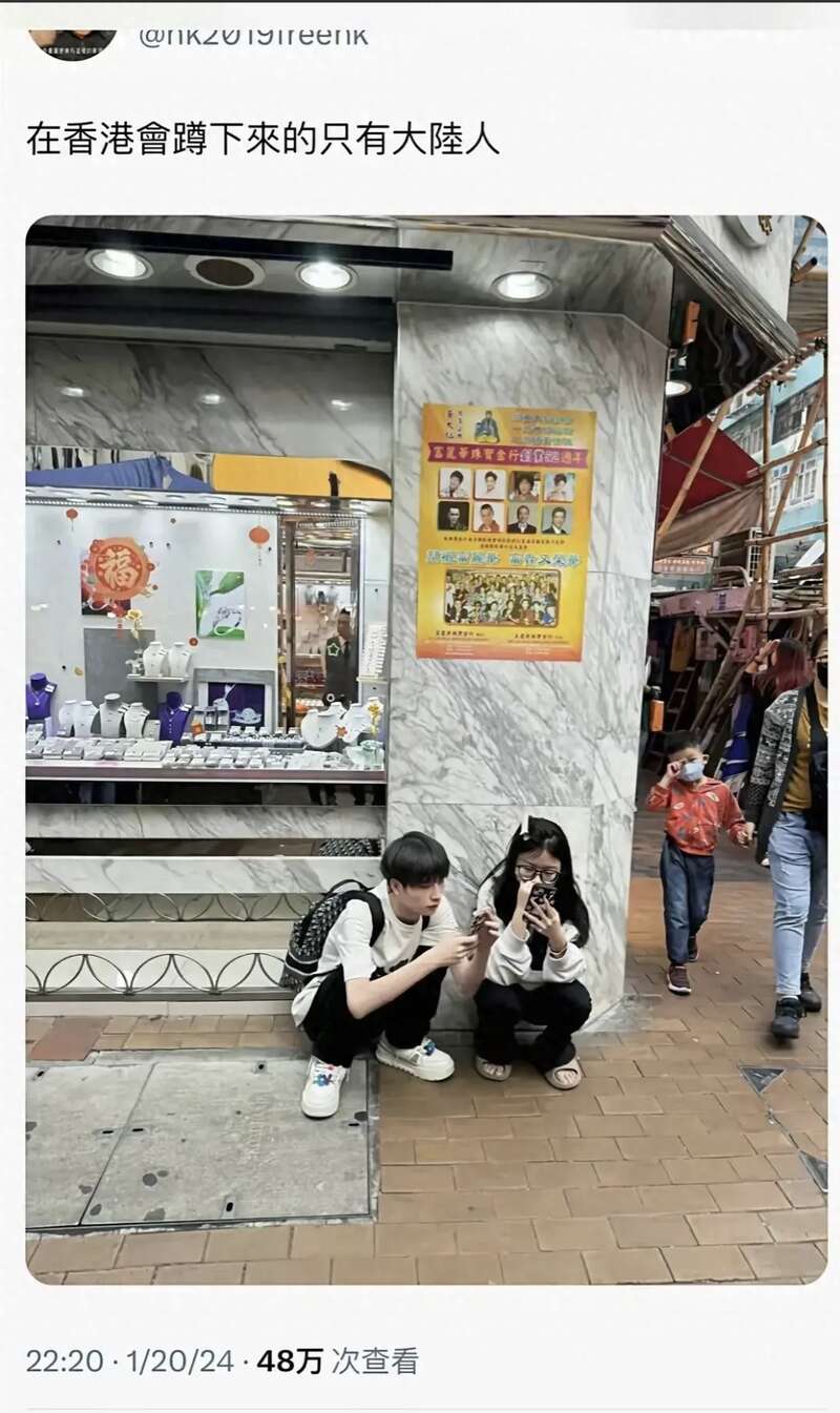 推文中,照片上的内地人蹲坐在路边,被批评为一种“陋习”。而言辞更是毫不留情,以高高在上的姿态指责这一行为,将蹲地的内地人视为“低级”而毫无教养。这篇推文如同一块石子投入湖中,激起层层涟漪,引发香港社交媒体上的广泛讨论和激烈争辩。