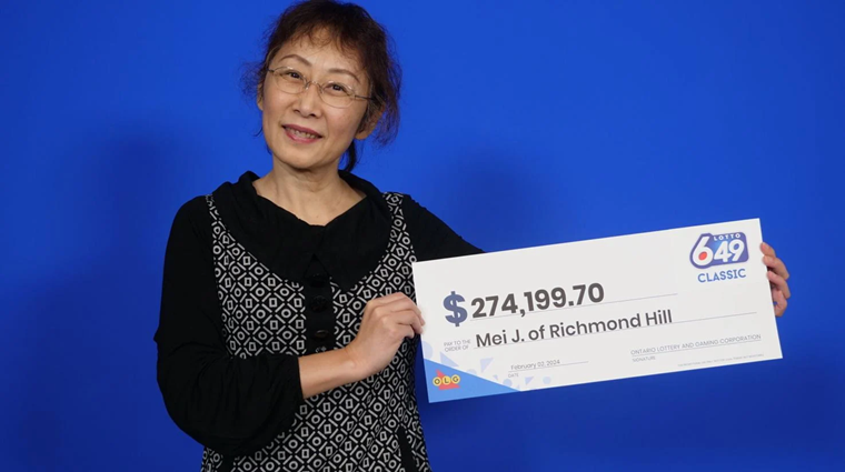 江女士(Mei Jiang)在1月13日的抽奖中赢得了乐透6/49二等奖,喜获274,199.70加元。