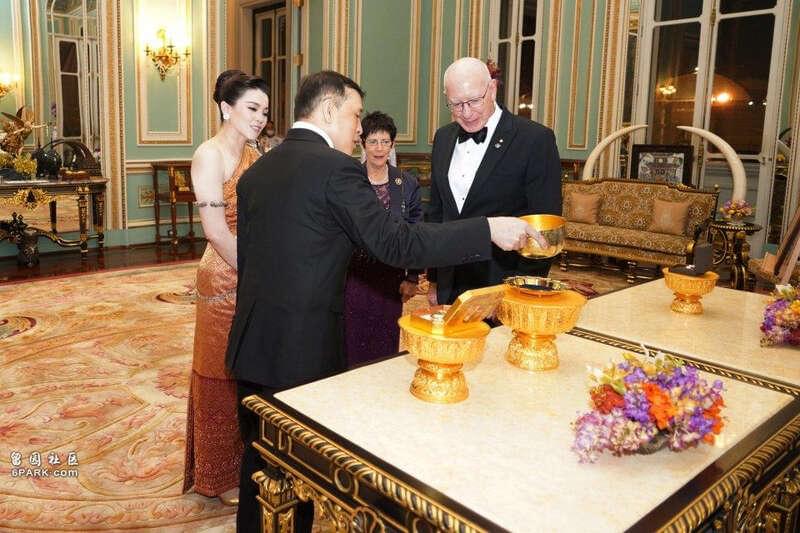 当地时间2月15日,泰国国王拉玛十世玛哈·哇集拉隆功,在曼谷大皇宫的王座大厅中举行晚宴,欢迎澳大利亚总督戴维·约翰·赫尔利(David John Hurley)及其妻子琳达·麦克马丁(Linda McMartin)的到访。