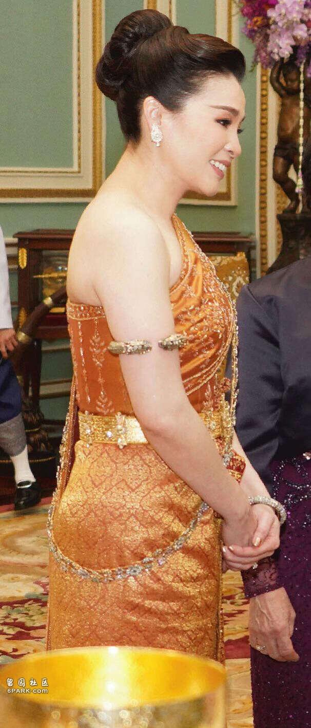 尽管她偏爱西式着装,但在当晚却罕见地选择了传统的泰式礼服裙,并且还用了各种的钻石首饰来修饰自己,尽显泰国王室的富庶。
