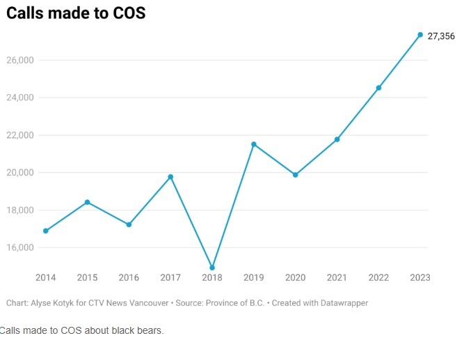 2023 年 COS 接到关于黑熊的报警电话数量高达 27356 个,是前所未有的历史新高记录。比上一年增加 2800 多个。