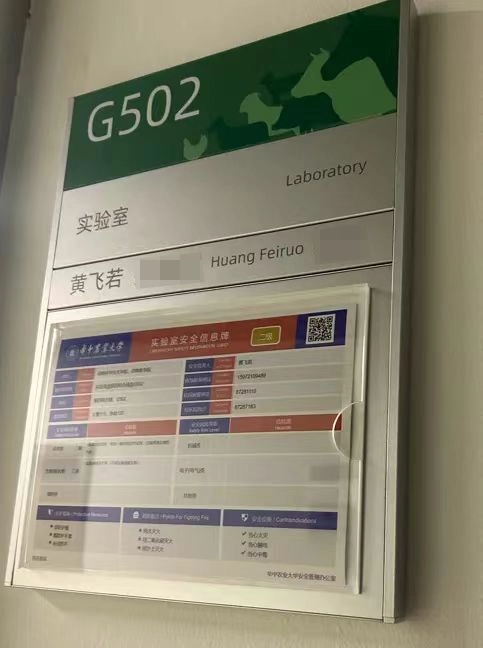 在5樓,我找到了黃飛若的實驗室。名牌上的信息顯示,這是黃飛若和另一位老師共用的實驗室,安全負責人是黃飛若,下方寫著手機號碼。接下來的幾天,我多次撥打這個號碼,不出意料地沒有人接。黃飛若的辦公室在實驗室斜對面,名牌還在,但已被停職的他顯然不可能在這時出現在辦公室