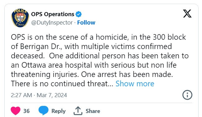 福特省长称渥太华大规模屠杀的消息“令人心碎”。福特在X上表示:我的心与六名遇难者的家人和朋友以及整个渥太华社区同在,他们正在遭受这场可怕的悲剧。