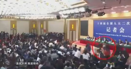 女记者在人大记者会冲向主席台。(视频截图)