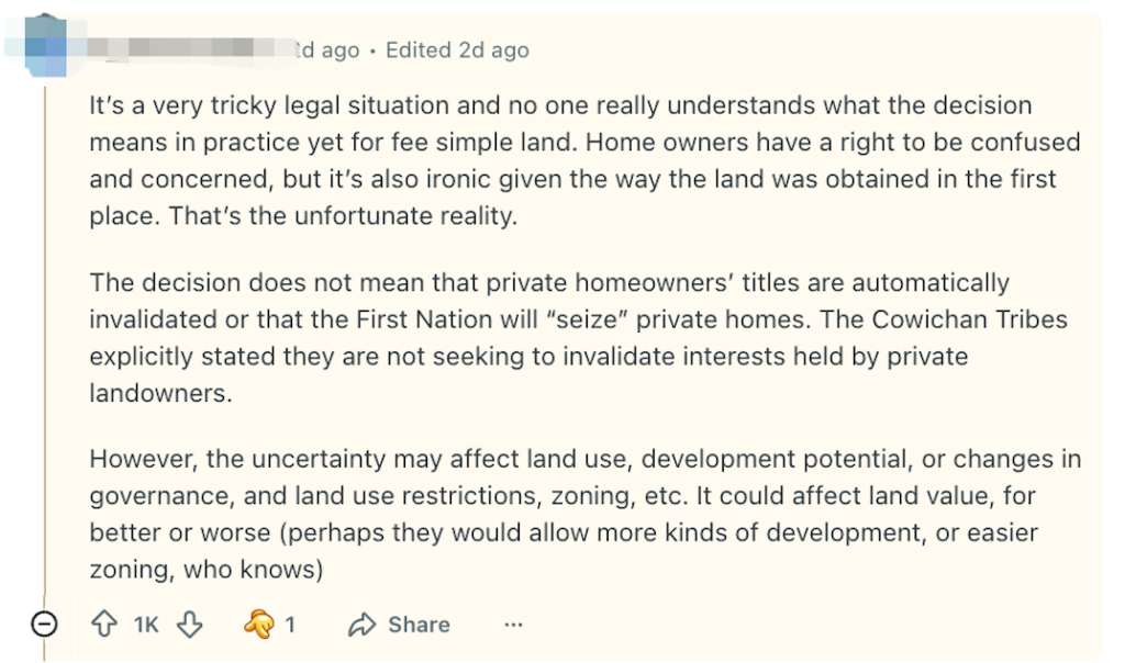 列治文市长马保定(Malcolm Brodie)也是对此表示,这个判决的影响“可能重塑甚至瓦解本省现行的土地所有制度”,而且其效应“不会只停在列治文,有可能扩散到全省乃至全国”。