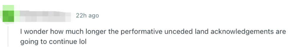 也有人略带讽刺地评论:“不知道那些每天仪式性念叨‘这是未割让原住民土地’的致辞,还要持续多久呢。”