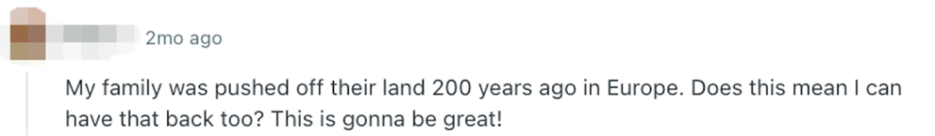 还有网友调侃:“两百年前,我的祖先在欧洲也被驱逐过,照这个逻辑,我是不是也能去要回土地?这下可精彩了。”