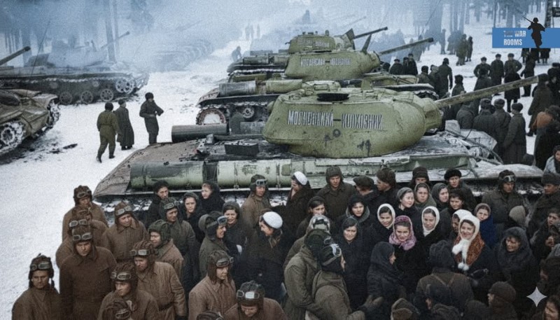 1942年12月,在俄罗斯莫斯科,苏联农民象征性地将完全由他们自己捐款和积蓄资助购买的KV-1S重型坦克移交给苏联坦克兵,以此有力地展现了战时的团结精神。