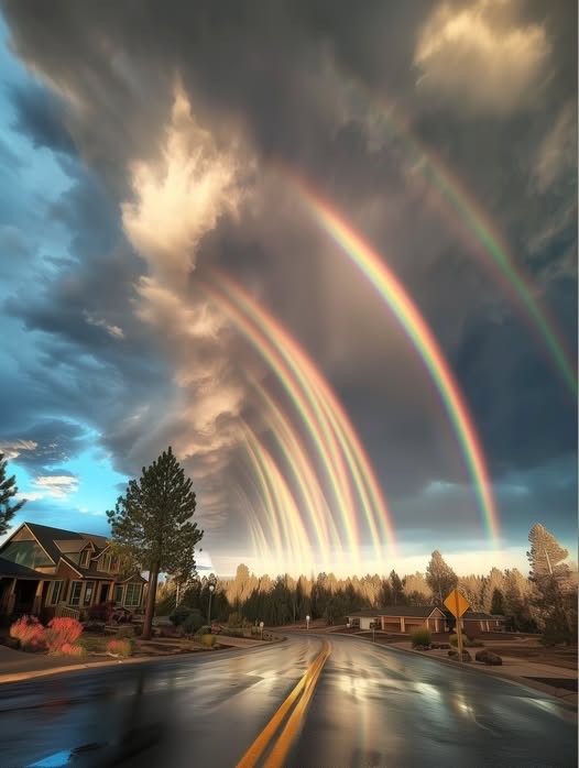 暴风雨过后,天空中出现了多道绚丽的彩虹。