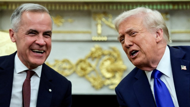 2025年10月7日,美國華盛頓,總統特朗普(Donald Trump,右)與加拿大總理卡尼(Mark Carney)在白宮橢圓形辦公室舉行會面。