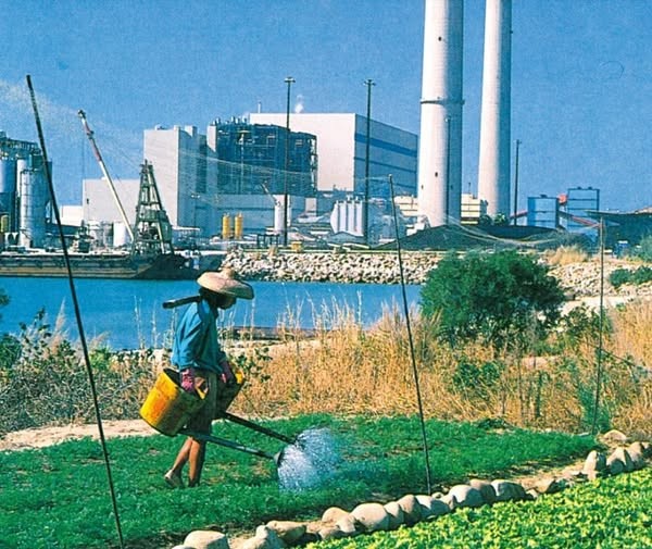 当年岛上仍然有居民以务农为生,农田与对岸新建成的发电厂形成了颇大的对比。
